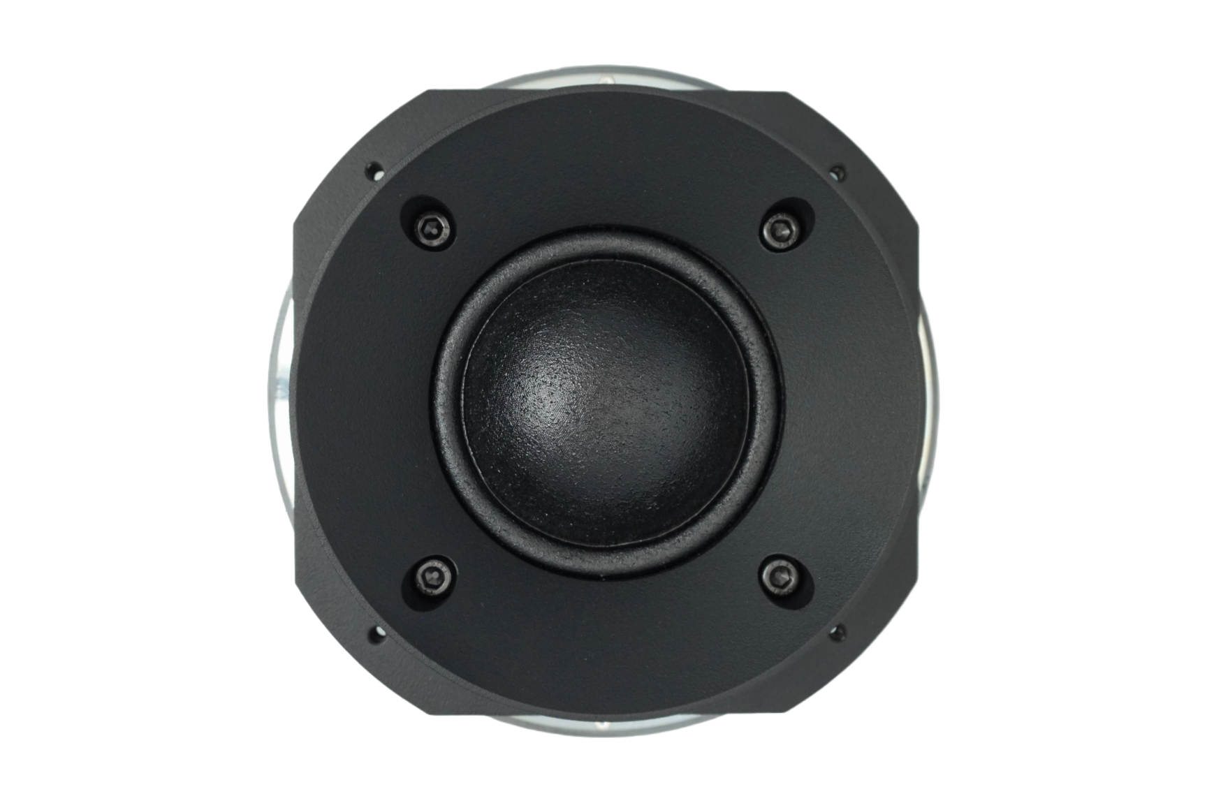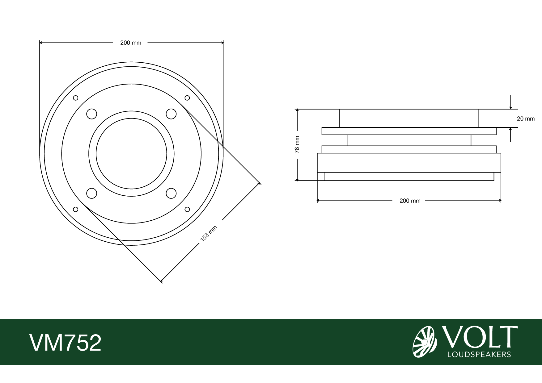 The VM752 is a 75mm diameter dome unit loaded by a short, front-mounted horn. It uses a single-layer, round wire copper coil slightly longer than the focussed magnet gap to allow for high excursions at the lower end of its operating range. The dome and surround are critically doped for smoothness and consistency of response, a second, rear surround maintains coil stability. The magnet system uses a 200mm (8") ceramic magnet for high efficiency and is solidly fixed to a painted, aluminium chassis. The termination braids are hidden inside the unit and are not visible, connection is by 6.4mm (0.25") spade terminals allowing soldering or push-on receptacles. The entire dome/coil assembly is built onto a replaceable ring that accurately self locates so allowing easy field replacement. The unit is intended for rear mounting, M5 threaded inserts are incorporated in the flange for fixing screws.